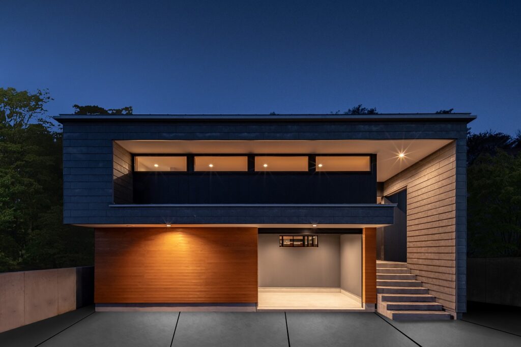 敷地の高低差を利用して作られた半地下のバイクガレージと