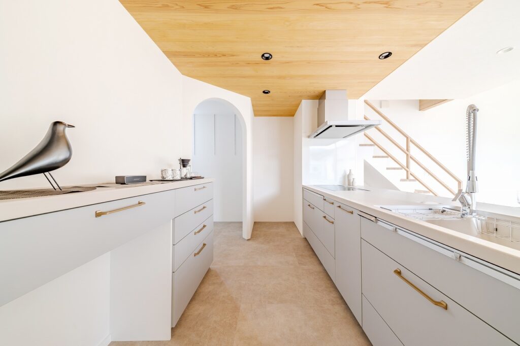 キッチン天井の木の素材感が、白を基調とした空間の中でやわらかなアクセントになっています。
