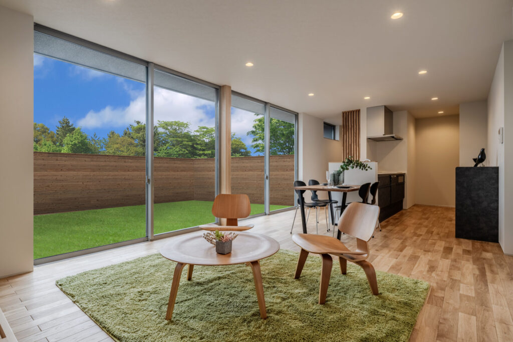 LDKの大開口部から、外の景色と光を取り込むリビング空間。